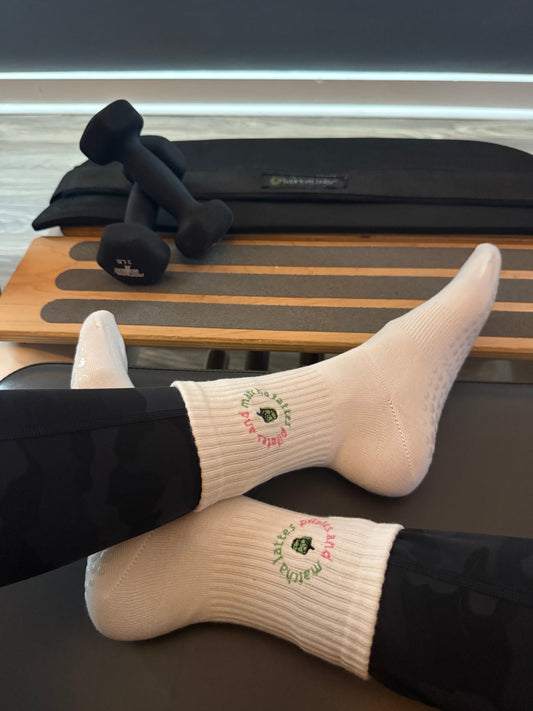 Matcha Latte Embroidered Socks – Pilates and Matcha Lattes | Crew, Calf, or Non-Slip for Pilates, Barre, Athleisure