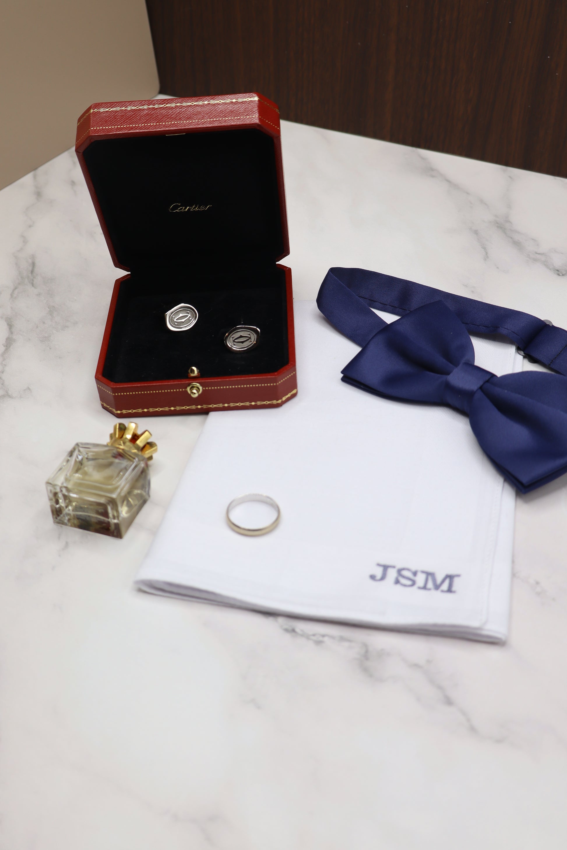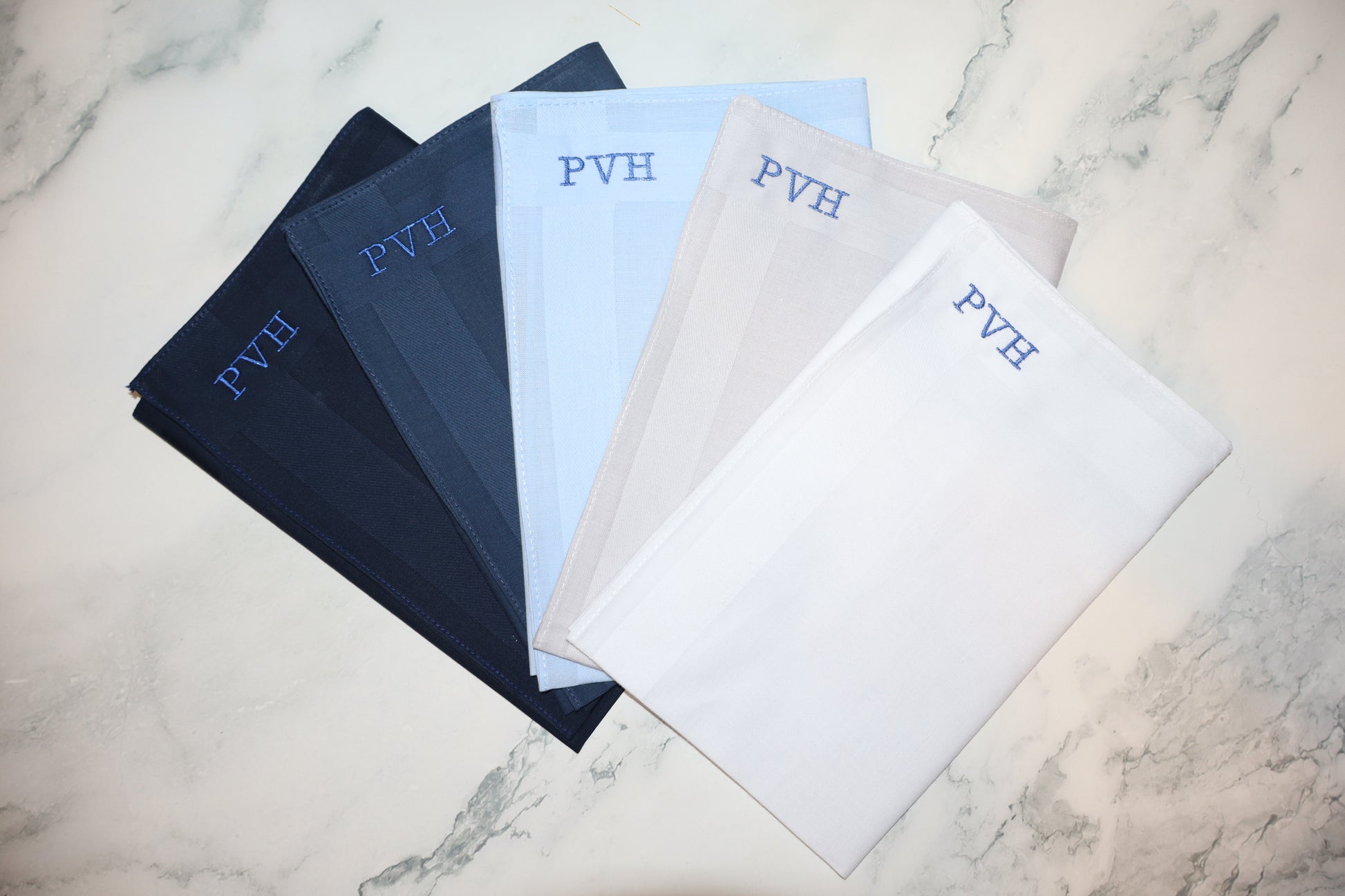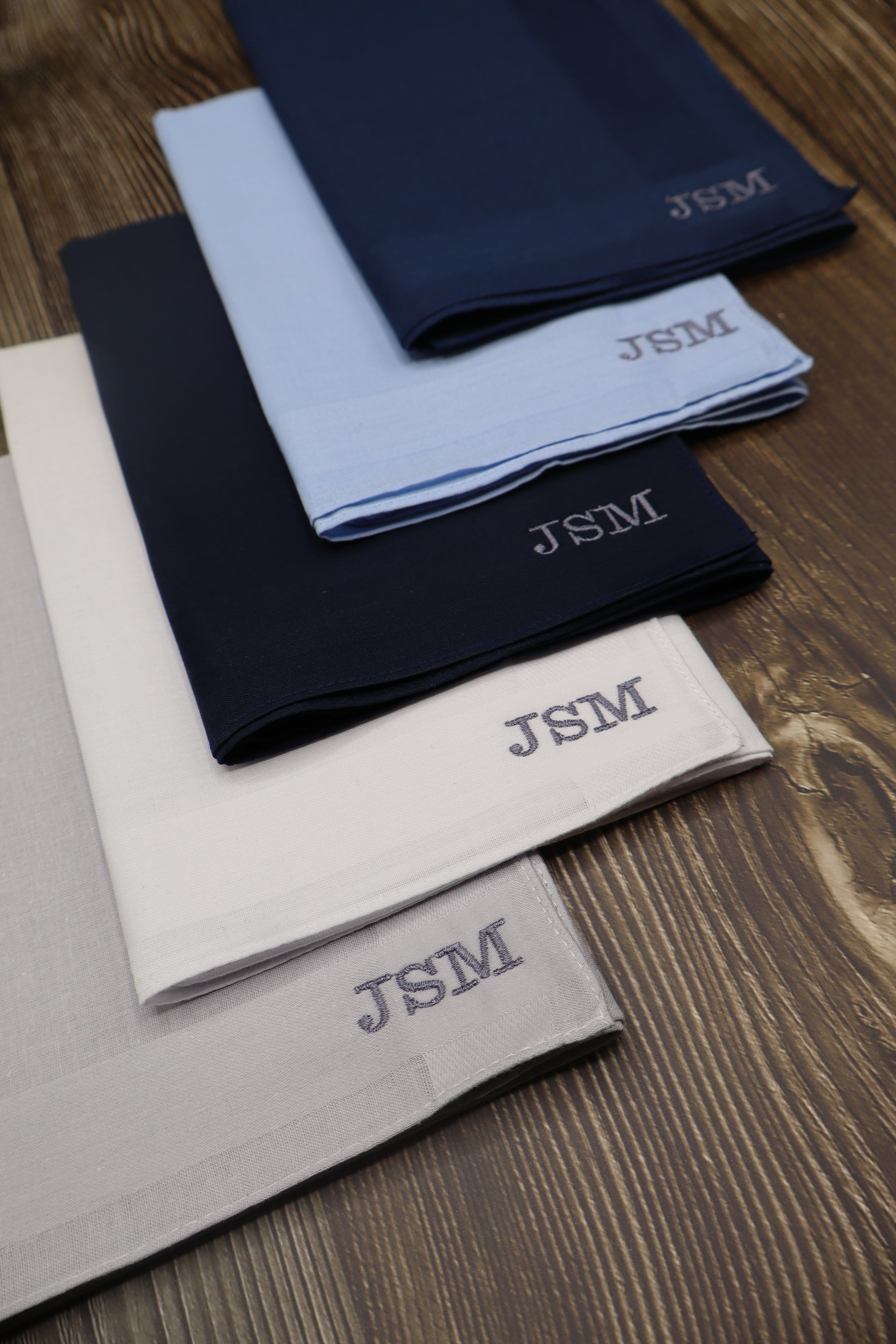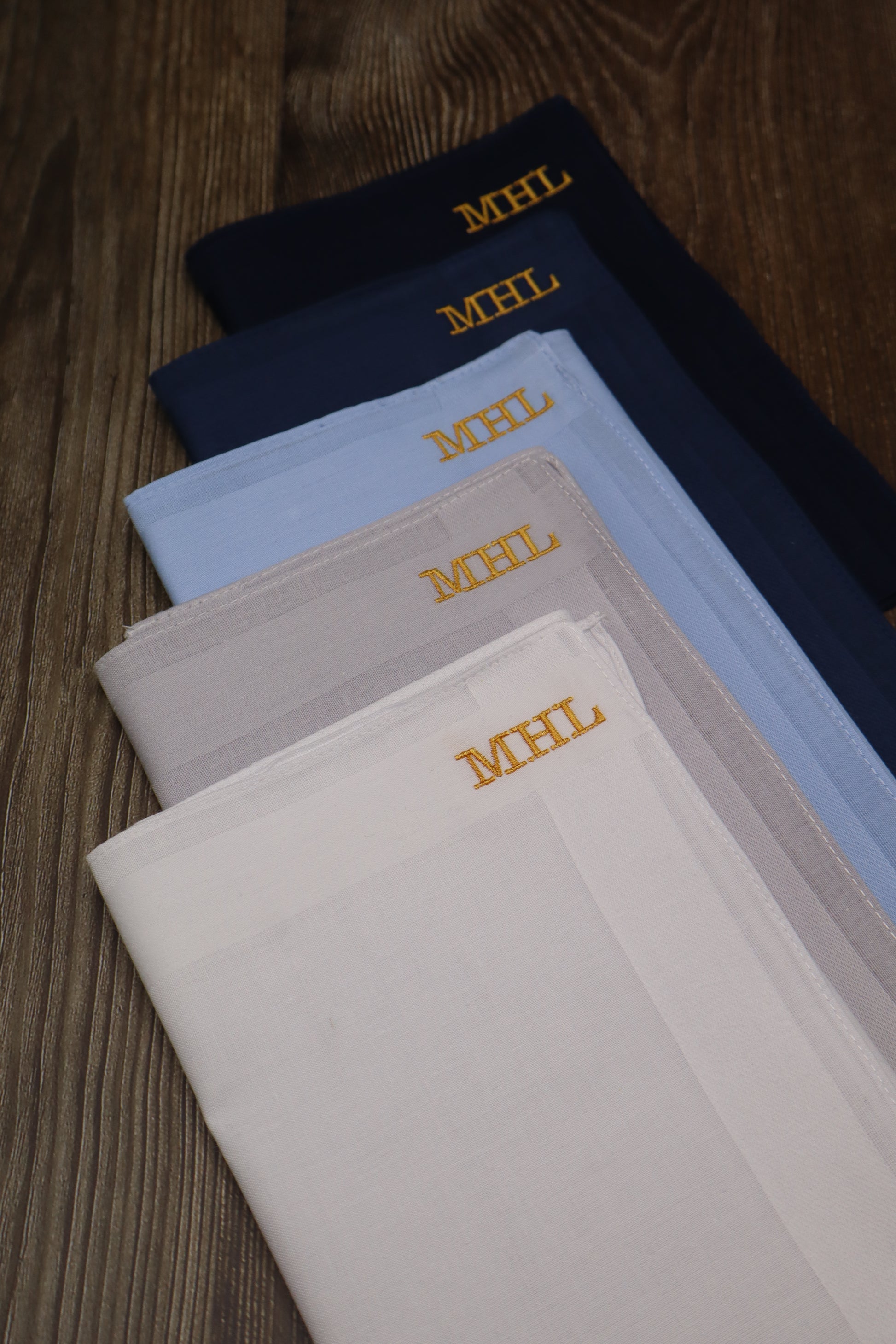 Timeless and sophisticated, The London Set features 5 elegant 16x16" cotton handkerchiefs in white, gray, light blue, navy, and dark blue. Each can be embroidered with up to 3 initials in a classic serif font for a refined, traditional look. Choose from a wide range of thread colors to make the set uniquely yours.